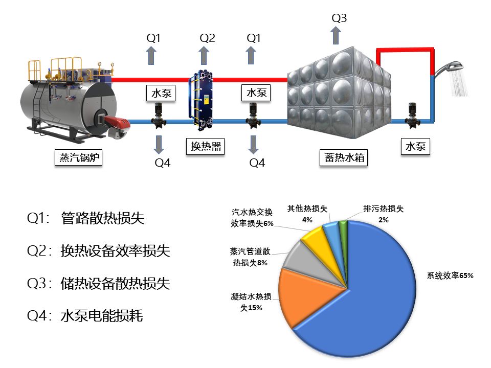 蒸汽系统由于蒸汽温度高,所以应用范围广,能满足大多数的工业和民用用热需求。一些有蒸汽需求的商业场所,不少也是通过换热器带水箱进行间接换热(也可以是与容积式换热器进行换热)。此系统具有以下特点: