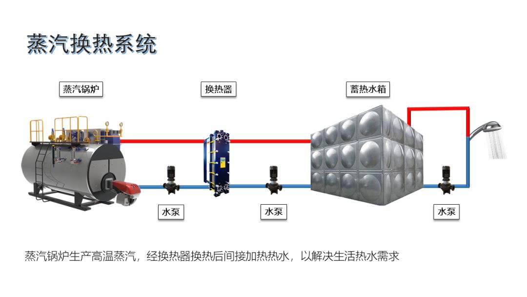 蒸汽锅炉在上个世纪60年代开始普及,当时国内的重工业发展迅速,各种工业生产由于过程中需要蒸汽,都会使用蒸汽锅炉。与此同时,高温蒸汽也可通过换热器进行间接换热,解决生活热水的需求。所以近水楼台先得月,蒸汽锅炉间接加热热水的系统应用形式也得到了很好的普及及应用。